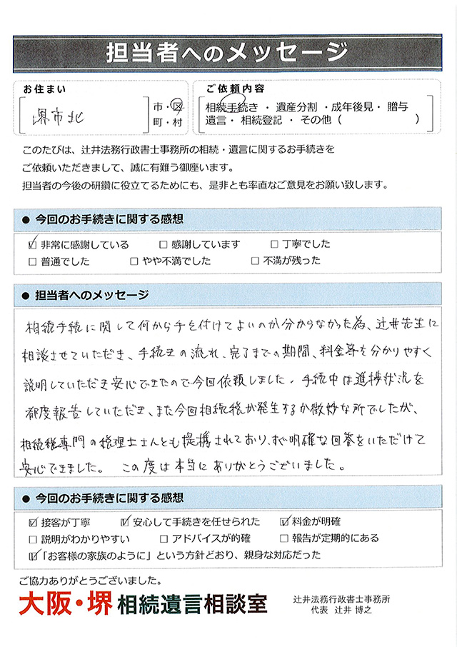 相続手続きに関して何から手を付けてよいのか分からなかった為、辻井先生に相談させていただき、手続きの流れ、完了までの期間、料金等を分かりやすく説明していただき安心できたので今回依頼しました。