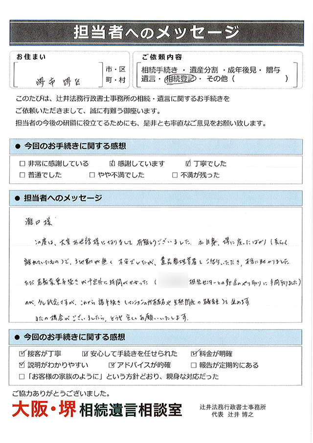この度は、大変お世話になりまして有難うございました。私自身、堺に戻ったばかり(長らく離れていたもの)で、土地勘が無く不安でしたが、遺品整理業者をご紹介いただき、本当に助かりました。