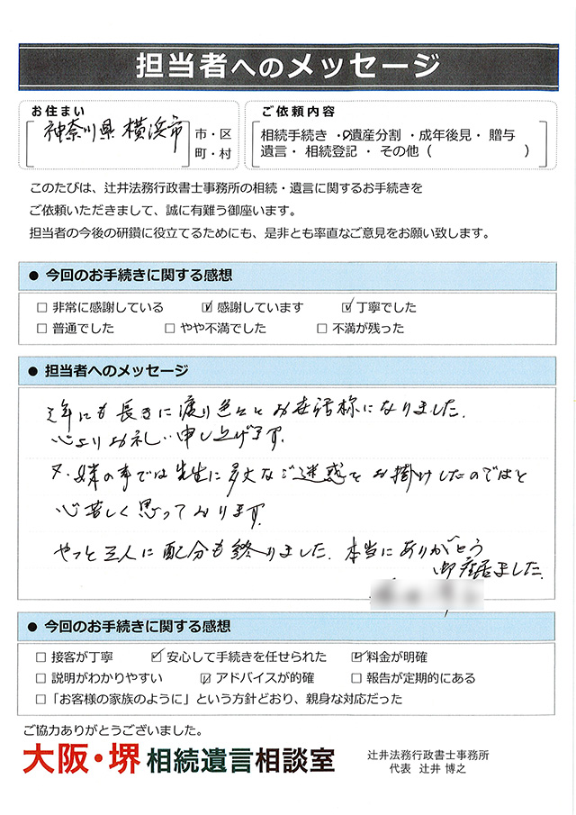 神奈川県横浜市の方からのメッセージ 2026年02月25日 三年にも及ぶ長きに渡り色々とお世話様になりました。心よりお礼申し上げます。又、妹の事では先生に多大なご迷惑をお掛けしたのではと心苦しく思っております。やっと三人に配分も終りました。本当にありがとう御座居ました。