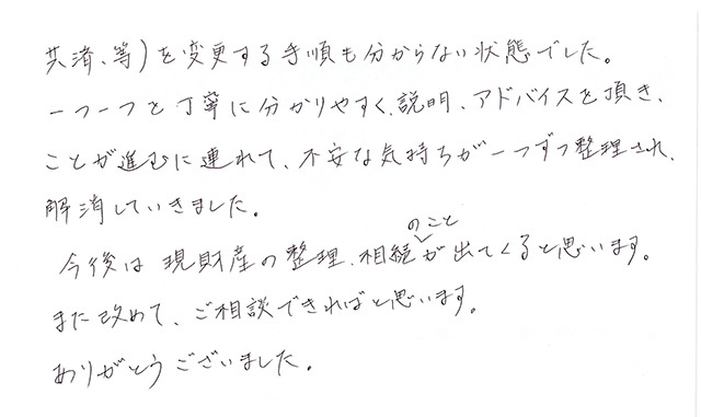 一つ一つを丁寧に分かりやすく、説明、アドバイスを頂き、ことが進むに連れて、不安な気持ちが一つずつ整理され、解消していきました。