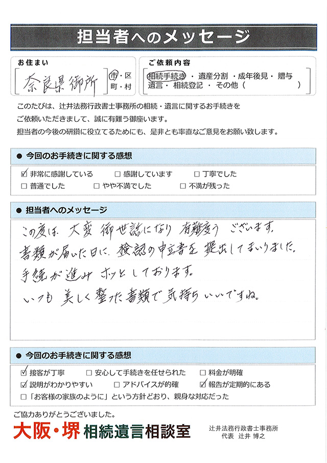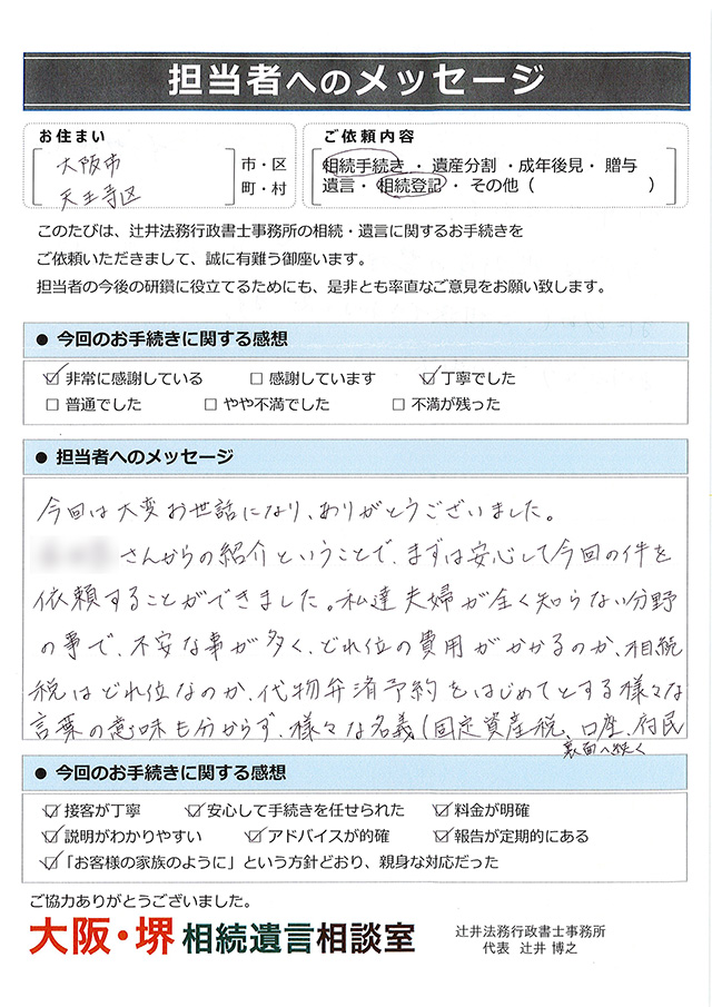 〇〇さんからの紹介ということで、まずは安心して今回の件を依頼することができました。私達夫婦が全く知らない分野の事で、不安な事が多く、どれ位の費用がかかるのか、相続税はどれ位なのか、代物弁済予約をはじめとする様々な言葉の意味も分からず、様々な名義(固定資産税、口座、府民共済、等)を変更する手順も分からない状態でした。